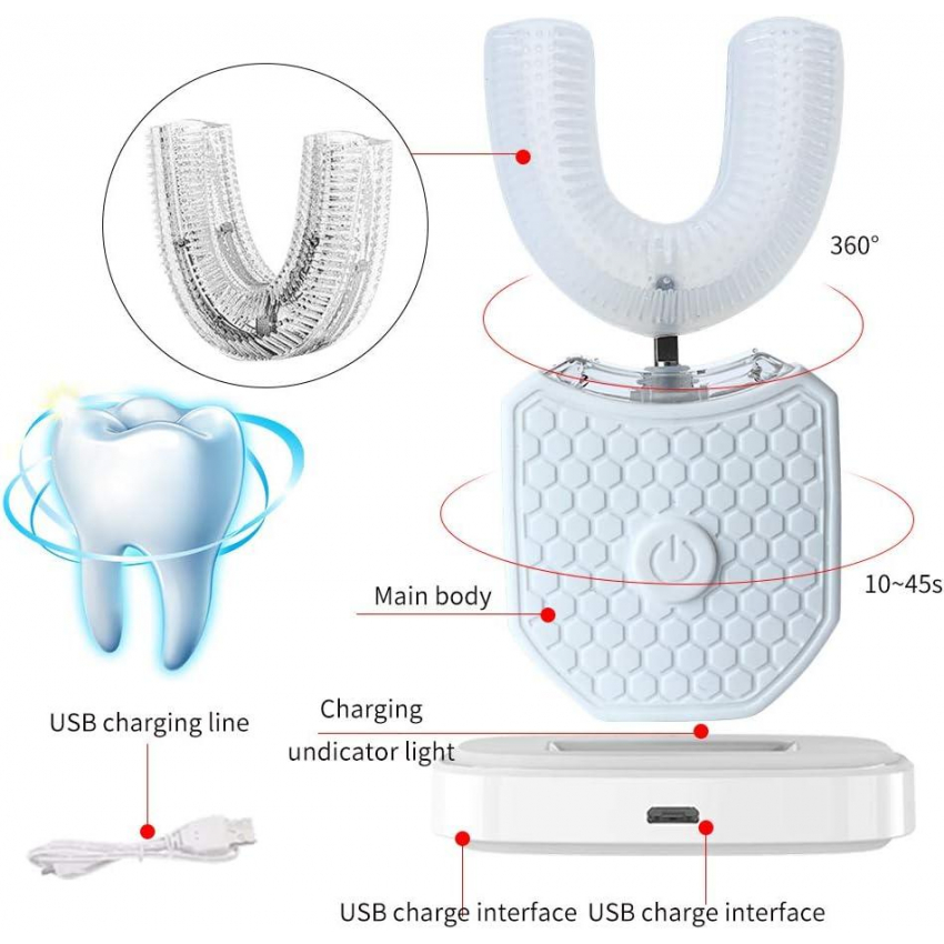 Автоматическая электрическая зубная щетка Magentak для взрослых, ультразвуковая, вращающаяся на 360 градусов, 100% пищевой силикон, U-образная, дорожная, белая