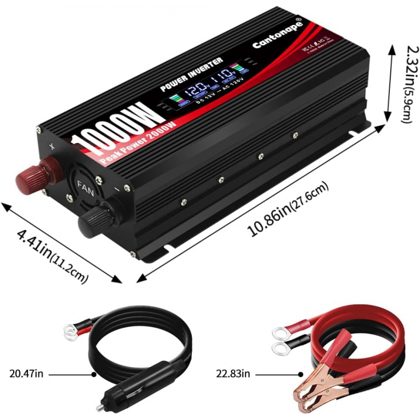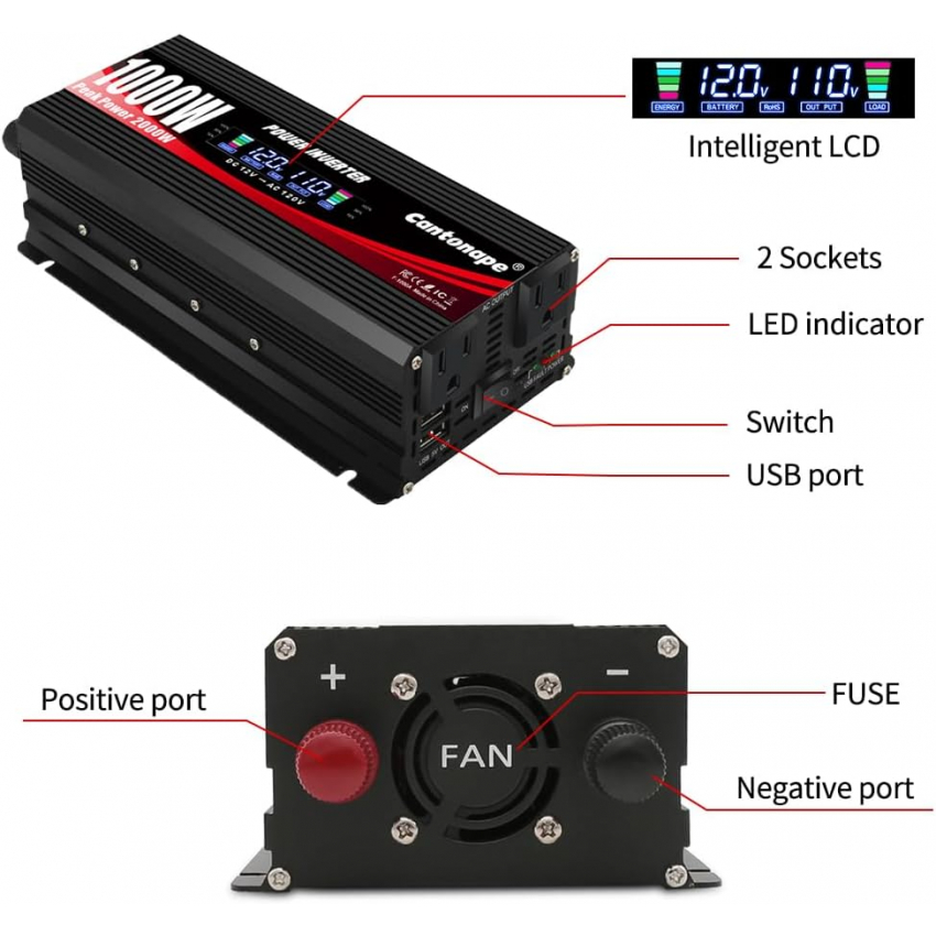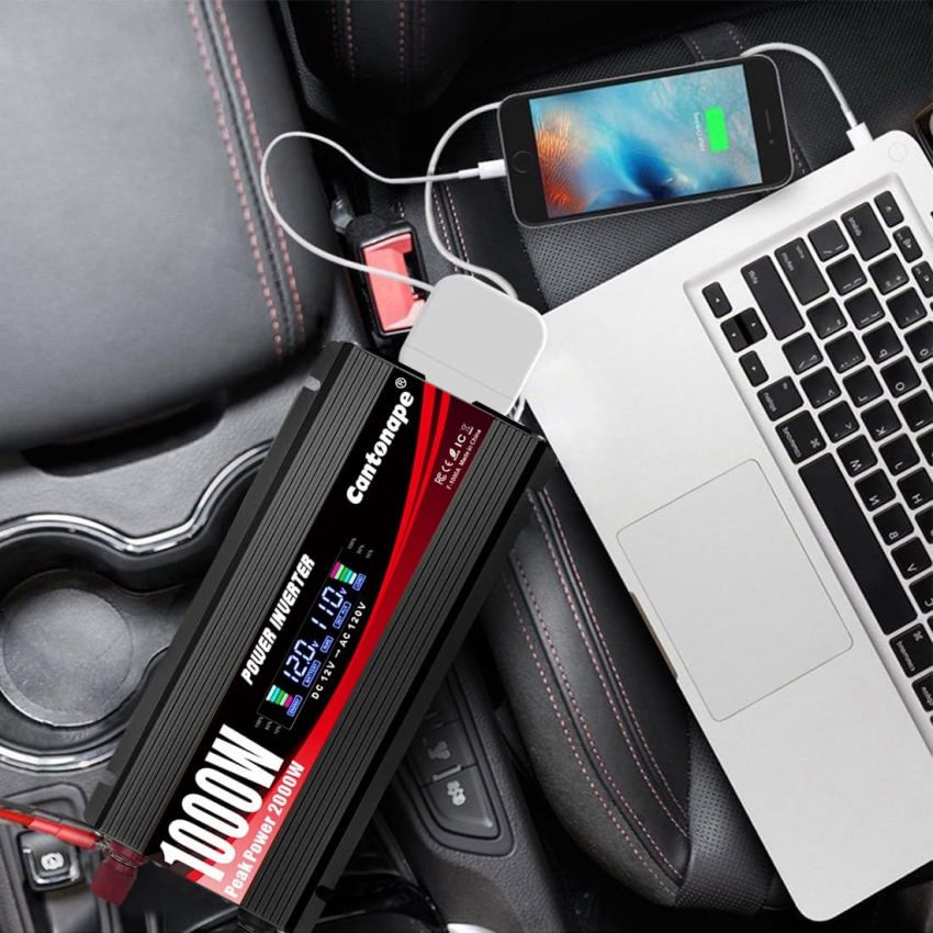 Автомобильный инвертор мощностью 1000 Вт, преобразователь постоянного тока 12 В в 110 В/120 В переменного тока с ЖК-дисплеем, двумя розетками переменного тока и двумя USB-портами, зарядное устройство для автомобиля, дома, ноутбука, грузовика, черный