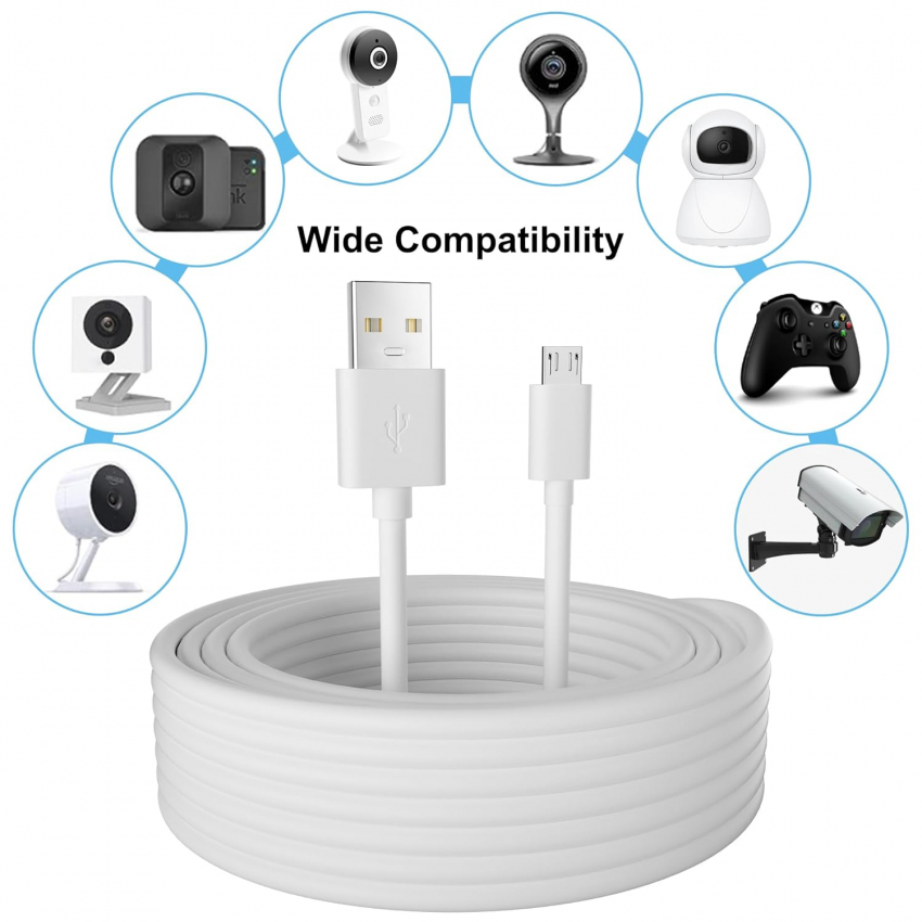 Комплект из 2 удлинительных кабелей питания USB-Micro USB длиной 6 метров (20 футов), длинный зарядный кабель, 21AWG OFC (бескислородная медь), совместим с камерами Wyze Cam, Nest Cam, Yi Home Camera, Kasa Cam Security Camera, белый.