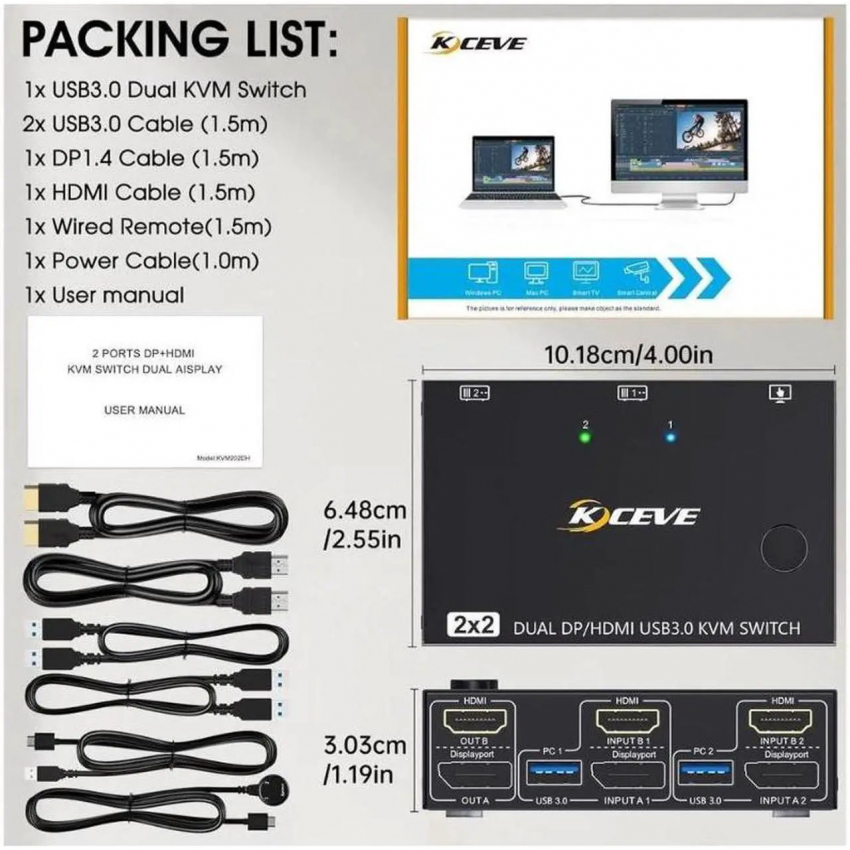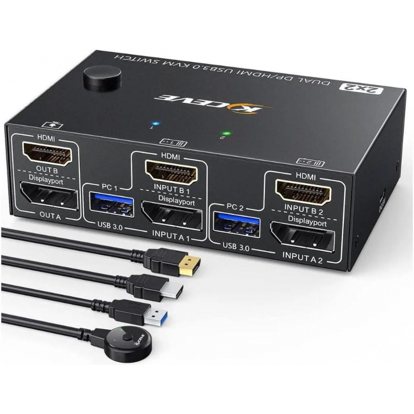 KVM-переключатель USB 3.0 с двумя мониторами, HDMI+Displayport 4K при 60 Гц, 2K при 120 Гц, Camgeet. KVM-переключатель для 2 мониторов и 2 компьютеров. Подключение 2 дисплеев и 4 устройств USB 3.0. В комплекте проводной пульт ДУ и 4 кабеля.