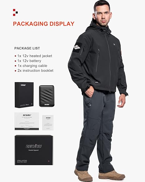 12 В, 5 зон нагрева: Куртка с подогревом оснащена 5 зонами нагрева из углеродного волокна (две спереди, одна сзади и по одной на каждом рукаве). Она может нагревать всю область тела и согревать вас, а две зоны нагрева возле передних карманов позволяют одновременно согревать руки. Вы можете регулировать 3 режима нагрева коротким нажатием кнопки питания (красный, синий и зеленый). Аккумулятор 12 В/интеллектуальный светодиодный дисплей: Встроенный аккумулятор высокой емкости 54 Втч, сертифицированный по стандартам CE/FCC, позволяет нагревать нагревательные элементы до 60°C за несколько секунд. Куртка с подогревом сохраняет тепло до 3,5-4 часов на высоком уровне нагрева и до 9-10 часов на низком. Порт USB Type-C можно использовать для зарядки смартфонов и других мобильных устройств.
