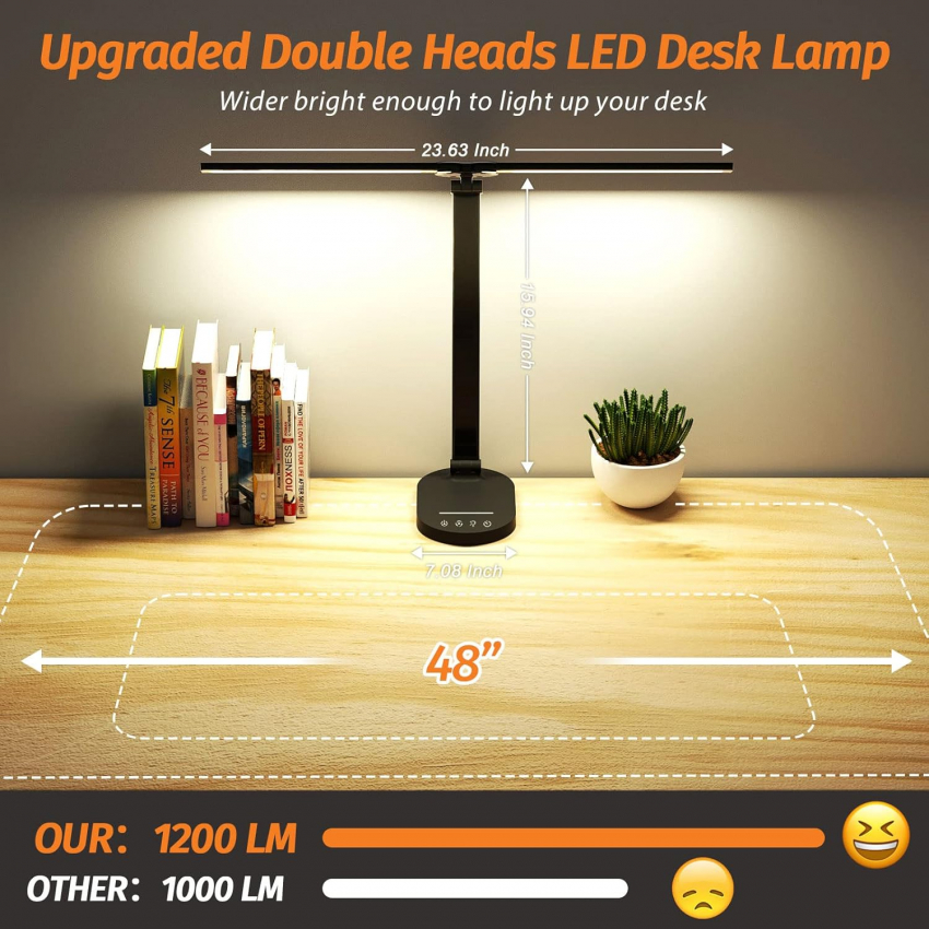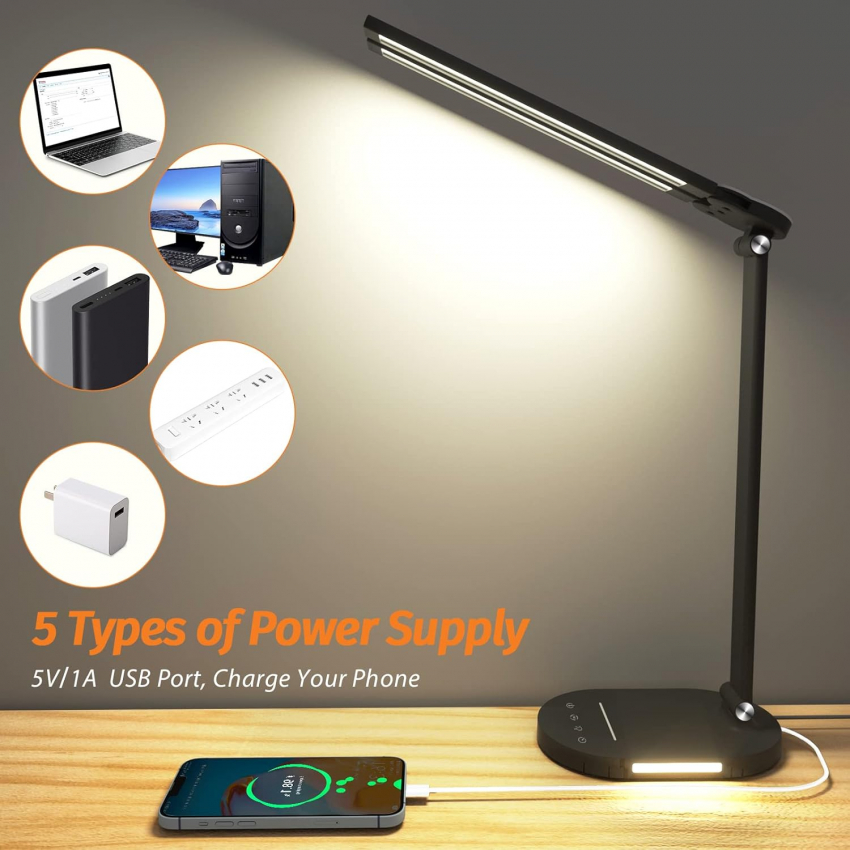 Настольная светодиодная лампа для дома и офиса, настольная лампа с двойным поворотным кронштеном, диммируемая настольная лампа с USB-портом для зарядки, офисная лампа с ночником, таймером на 1 час, 5 уровней яркости, настольная лампа, бережно относящаяся к глазам.