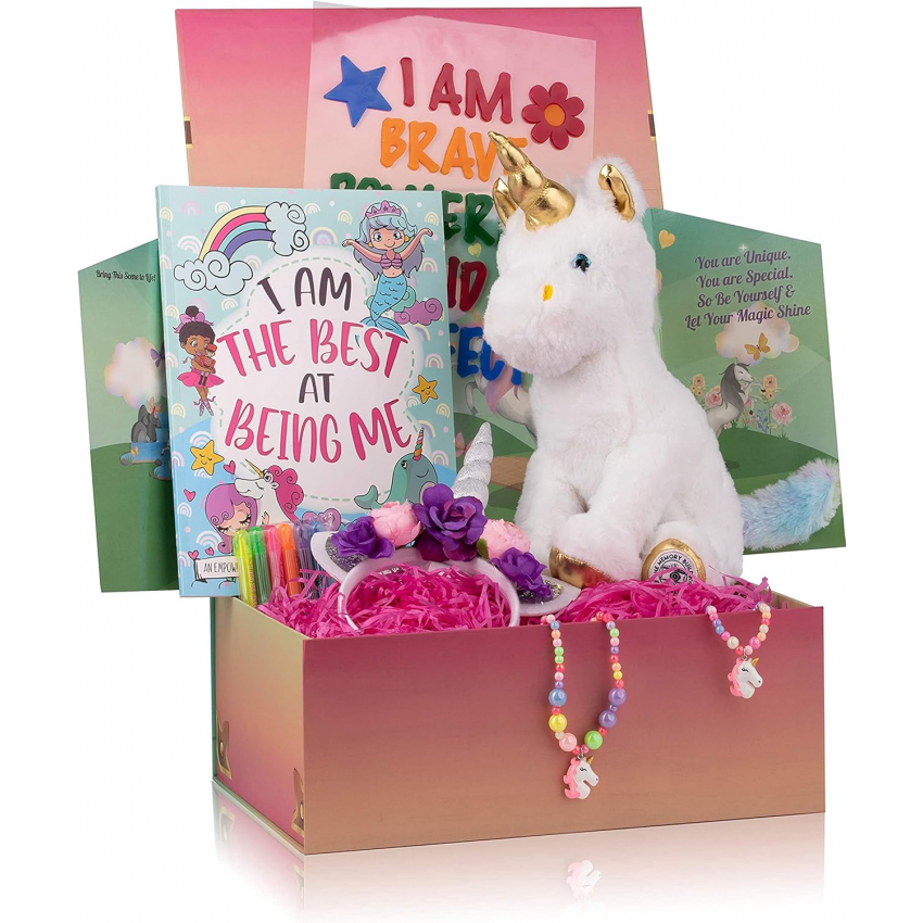 Яркий и волшебный подарок в виде большой коробки-сюрприза на тему единорогов станет отличным способом порадовать ребёнка и развить его воображение. Внутри — мягкая игрушка в виде единорога и разнообразные тематические аксессуары, включая раскраску и маркеры для творческого самовыражения.
