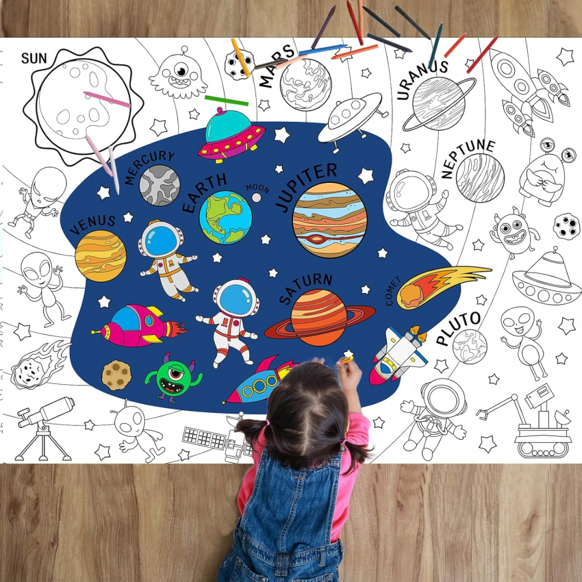 Широкая область применения: Космическая тематика идеально подходит для украшения пространства на детском дне рождения. Постер можно разместить на полу, стенах или столах. Его размер достаточен, чтобы все могли поучаствовать в раскрашивании. Отличный выбор для праздников, уроков, занятий с детьми и подарков.
