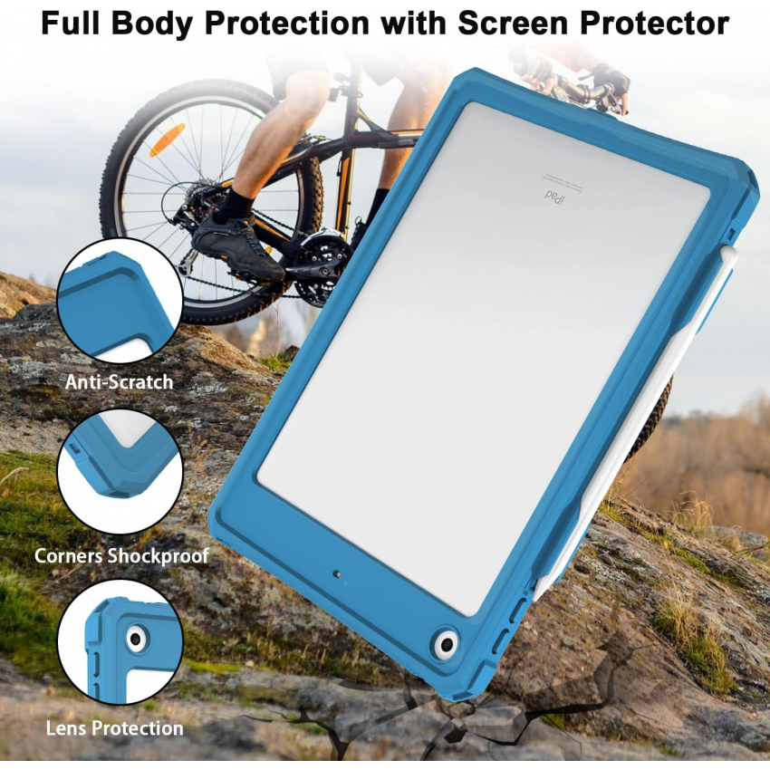 Дополнительные элементы включают встроенный держатель для стилуса Apple Pencil и регулируемый плечевой ремень, благодаря которому устройство удобно носить как взрослым, так и детям. Чехол обеспечивает устойчивое положение на поверхности и защищает устройство даже при длительной эксплуатации в подвижных условиях — будь то обучение, путешествия или повседневное использование.