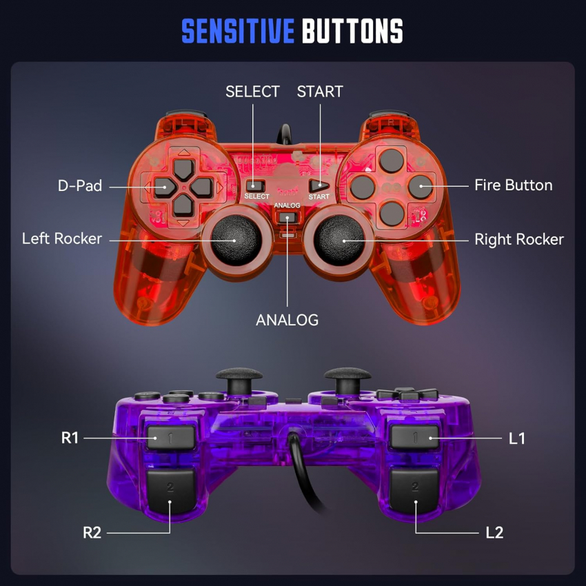 Проводной контроллер Doueuain для PS2, 2 пульта дистанционного управления для геймпада Double Shock, совместимых с PlayStation 2, с кабелем 1,8 м (прозрачно-красный и прозрачно-фиолетовый)