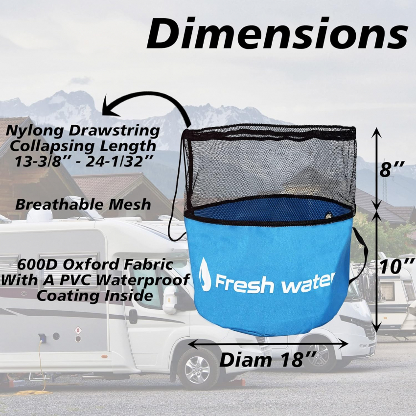 Водонепроницаемая сумка диаметром около 18 дюймов, предназначена для хранения чистой воды и шлангов. Изготовлена из прочного Oxford-материала с PVC-покрытием, обеспечивает защиту от влаги и долговечность. Вентиляционная сетка позволяет воде испаряться, предотвращая появление плесени и неприятных запахов. Идеальна для аккуратного хранения и быстрого доступа к свежей воде в вашем RV.