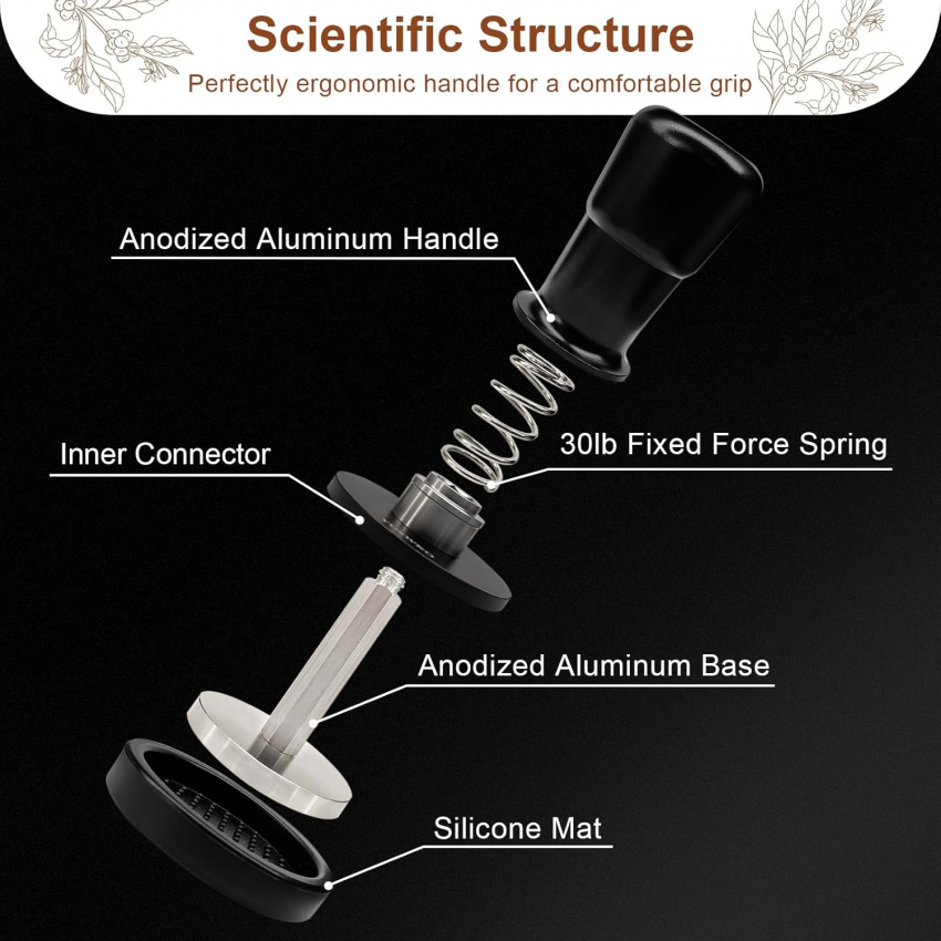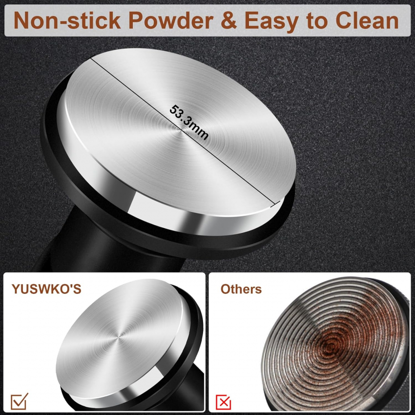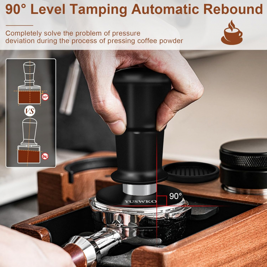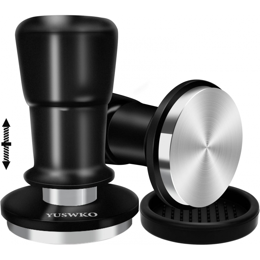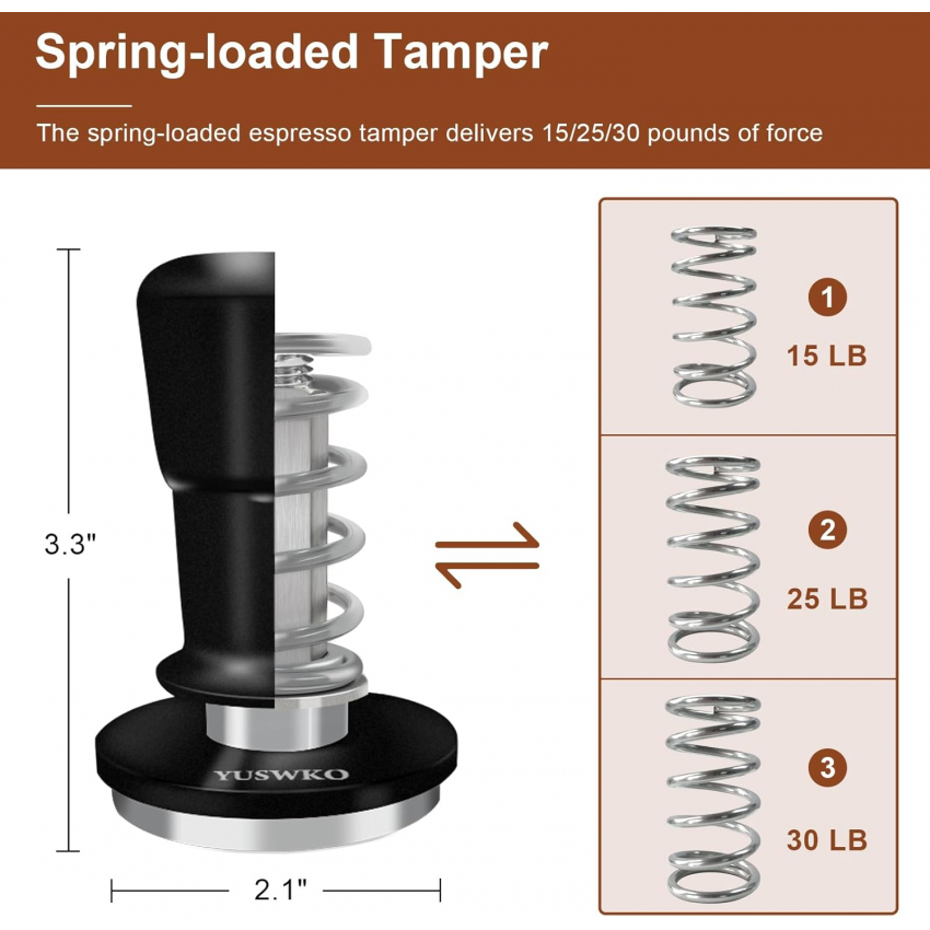 Темпер для эспрессо YUSWKO 53,3 мм, пружинный темпер для кофе с запасными пружинами 15/25/30 фунтов, ручка и подставка из анодированного алюминия, плоское основание из нержавеющей стали.
