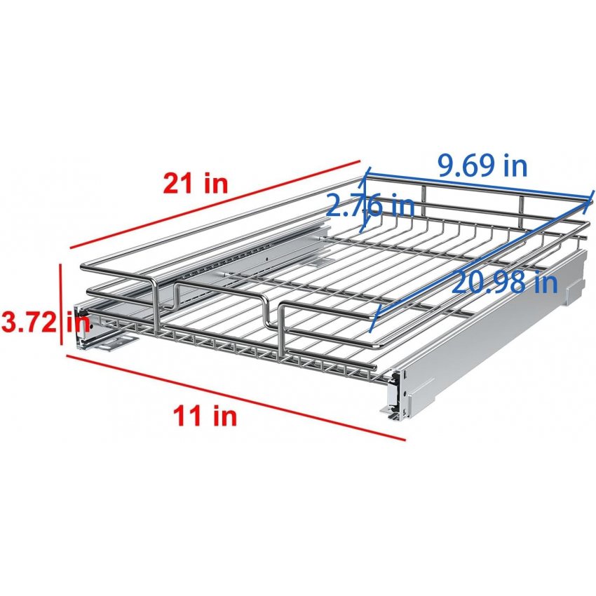 ОПТИМИЗАЦИЯ ПРОСТРАНСТВА Общие размеры: 11 дюймов (Ш) x 21 дюйм (Г) x 3,72 дюйма (В) (максимальный размер, фактический размер корзины будет на 1-2 дюйма (2,5-5 см) меньше). Подходит для проёма шкафа шириной не менее 12 дюймов (30 см), глубиной 24 дюйма (61 см) (размеры указаны без учёта петель). Размер корзины: ширина 9,69 дюйма (Ш) x глубина 20,98 дюйма (Г) x высота 2,76 дюйма (6,7 см) Премиальный прочный усиленный стальной каркас, выдерживающий нагрузку до 45 кг на полку. Отделка позволяет использовать стеллаж в ванной комнате или на кухне с повышенной влажностью.