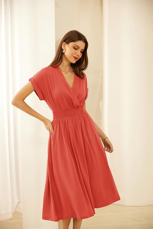 В этом повседневном платье использованы стильный V-образный вырез и аккуратные короткие рукава с эффектом складки. V-образный вырез подчеркивает ключицы и придает образу очарование. Короткие рукава с аккуратной складкой у края добавляют изящества и завершенности дизайну.