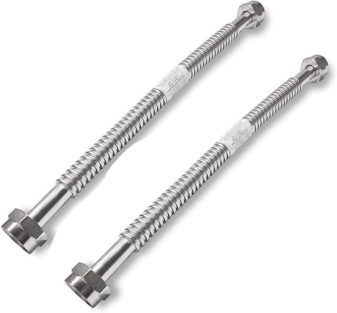 2 прочных гофрированных гибких водопроводных соединителя из нержавеющей стали с толстыми шайбами для водонагревателя и умягчителя воды (18x1 FIP) Идеально подходит для подключения водонагревателей, проточных водонагревателей и умягчителей воды. Выдерживает высокое давление 125 фунтов на кв. дюйм. Размер: 1 дюйм x 18 дюймов. Поворотное соединение с внутренней резьбой гайки обеспечивает гибкую и легкую установку без перегибов Соответствует закону об отсутствии свинца Сверхпрочные шайбы