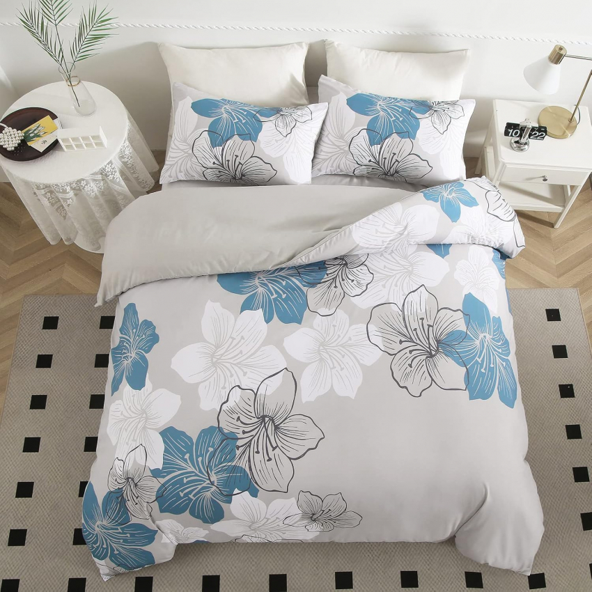 Нежный комплект из микрофибры с утонченным цветочным принтом сочетает в себе визуальную гармонию и практичность. Мягкая, дышащая ткань с изысканным узором в виде синих лилий на сером фоне делает спальню особенно уютной и придаёт интерьеру легкий акцент бохо-элегантности. Подходит для использования в течение всего года благодаря своей лёгкости и воздухопроницаемости.