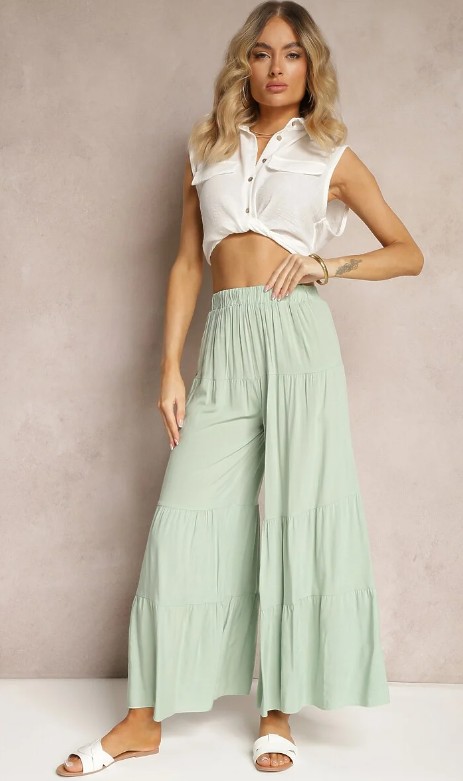 Эти нежно-зеленые брюки палаццо с аккуратными воланами по бокам и удобной резинкой на поясе идеально подойдут для создания стильного и женственного образа. Широкие штанины дарят свободу движений и легкость, подчеркивая изысканность и утонченность фигуры. Эластичный пояс не только комфортен, но и обеспечивает идеальную посадку на талии. Эти брюки прекрасно сочетаются с легкими топами и майками, создавая гармоничный и свежий летний стиль. Отличный выбор для прогулок, встреч с друзьями или отдыха в теплое время года.