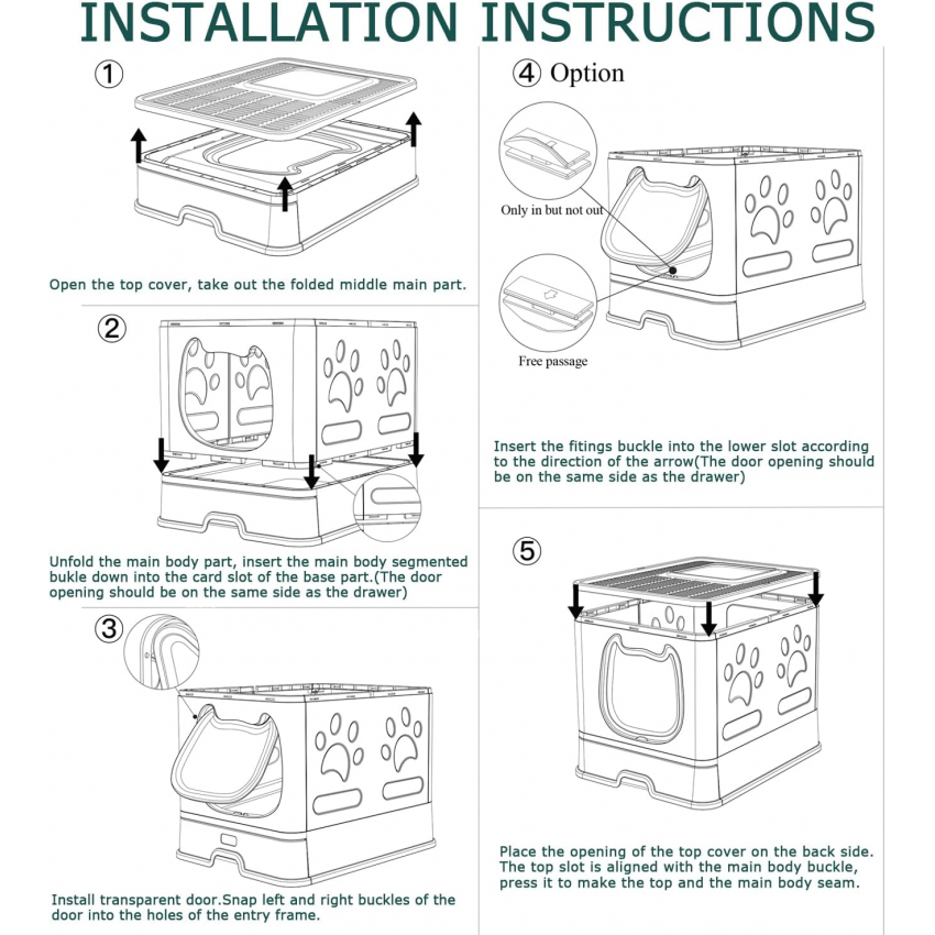 Качающаяся передняя дверь, оснащенная раздвижными защелками, может быть установлена как Только вход, Только выход или Свободный доступ, чтобы удовлетворить предпочтения любой кошки. Вы можете настроить ее в зависимости от разных кошек и идеально подходит для новых владельцев домашних животных