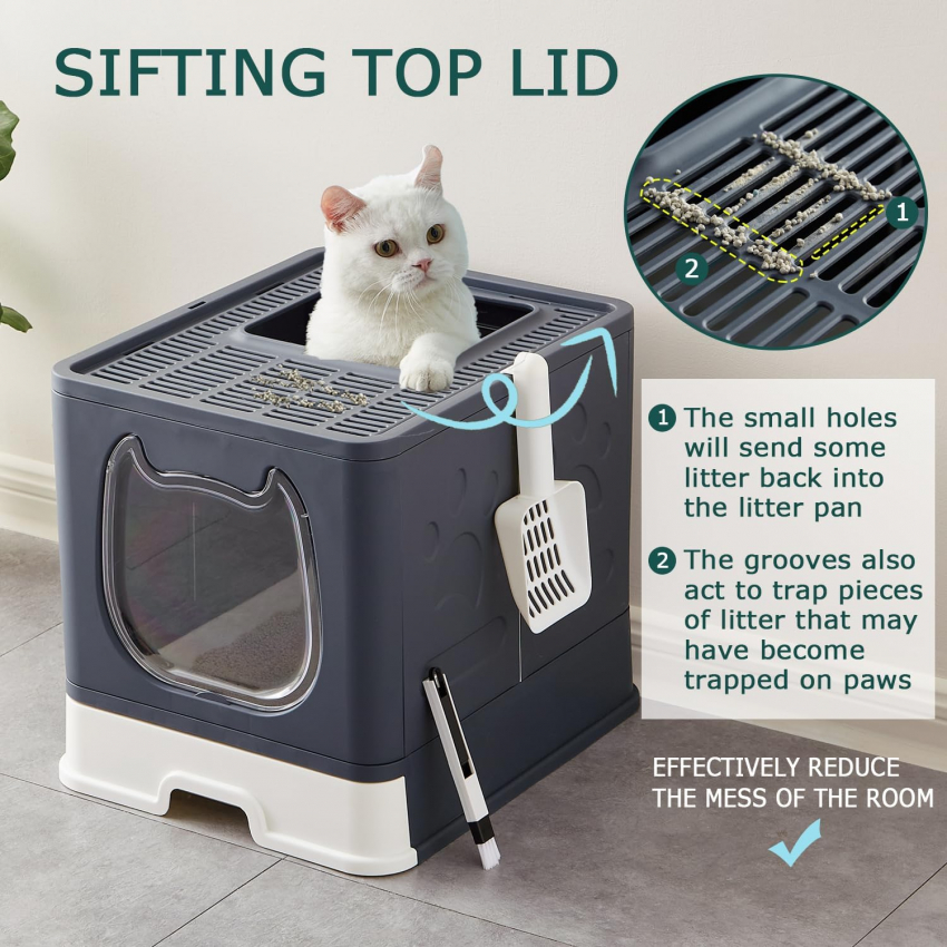 Небольшие отверстия на крышке направляют наполнитель обратно в лоток и не дают ему рассыпаться, когда вы покидаете кошачий лоток. Формованные крючки позволяют легко повесить прилагаемый совок для удобного хранения. В комплект входят совок и щетка для чистки 2-1