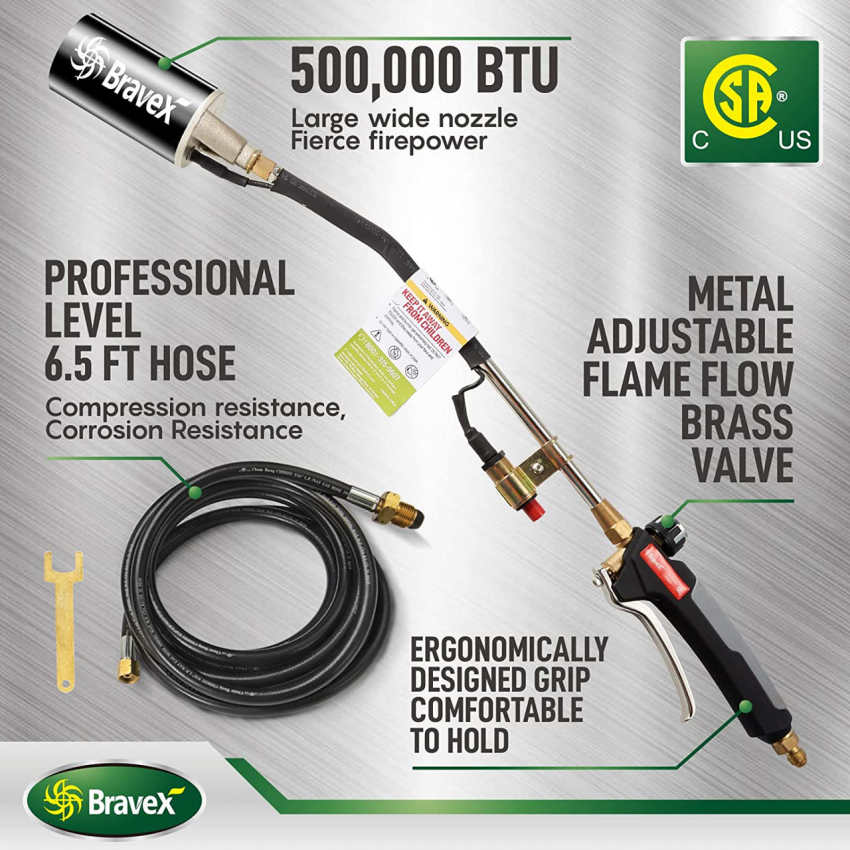 Сверхмощная пропановая горелка Bravex с пьезоподжигом Эта пропановая горелка универсальна для сжигания сорняков и пней, таяния снега, обжаривания мяса или рыбы, разжигания костров, сварки, сжигания древесных волокон, размягчения асфальта, удаления краски с негорючих поверхностей и многого другого.