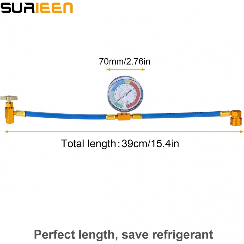 Автомобильный комплект для заправки переменного тока подходит для хладагента R134A R12 или R22 для автомобильного или домашнего кондиционирования воздуха, с высокой рабочей производительностью. Встроенный предохранительный клапан для предотвращения случайного выброса хладагента. Этот шланг переменного тока предназначен ТОЛЬКО для работы с прокалывающими баллонами типа R-134a.